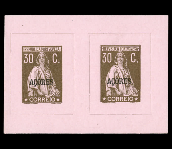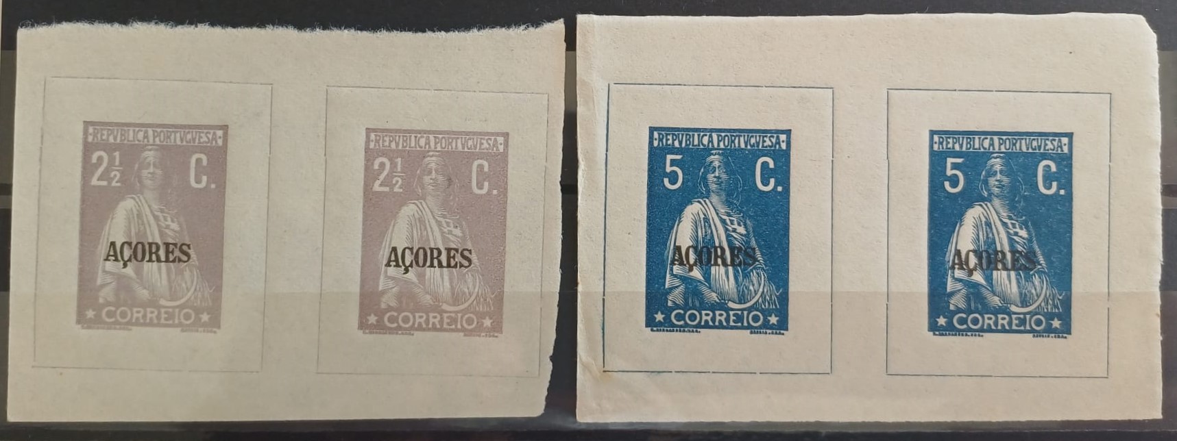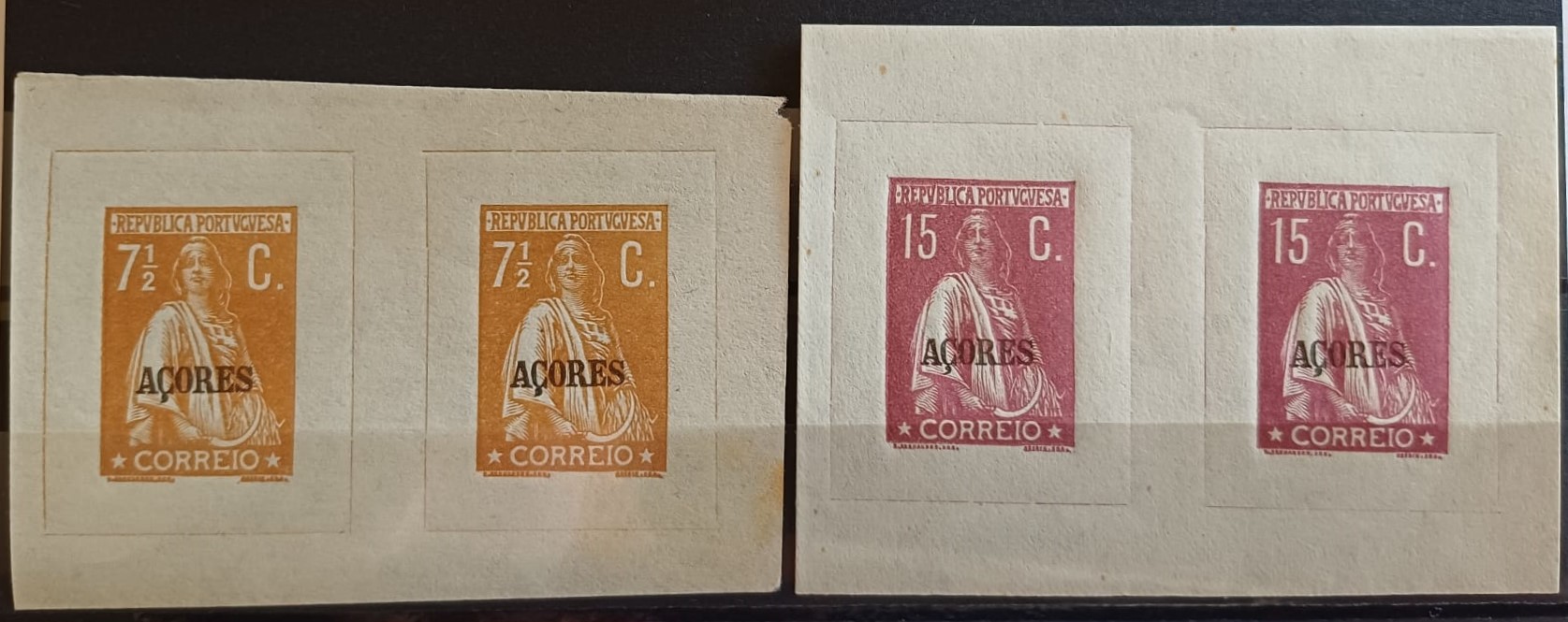 1354 imageAzores 1912-13 – Ceres with AZORES overprint. Mf#156, 7.5 c. bistre + Mf#159 of 15 c. red lilac. 2 strips with 2 color proofs each, undented, ungummed, without defects or repairs, with good color. Proofs considered clandestine.(Image 1)