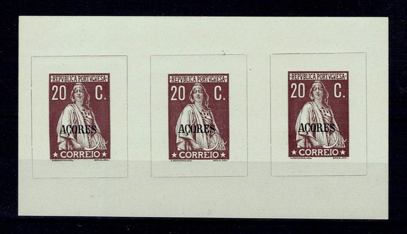 1355 imageAzores 1912-13 – Ceres with AZORES overprint. MF160, 20c, chocolate w/o green. Strip with 3 colour tests, no dents, no gum, no defects or repairs, with good colour. Tests considered to be clandestine.(Image 1)
