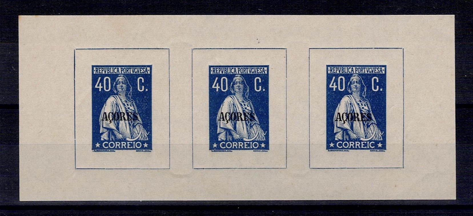 1357 imageAzores 1923 – Ceres. New colours and values. MF196a, 40c, blue. Strip with 3 colour proofs, in blue (approved colour), without dents, without gum, without defects or repairs, with good colour and with the cliché variety “CORREIC” in the 3rd proof. Proofs considered to be clandestine.(Image 1)