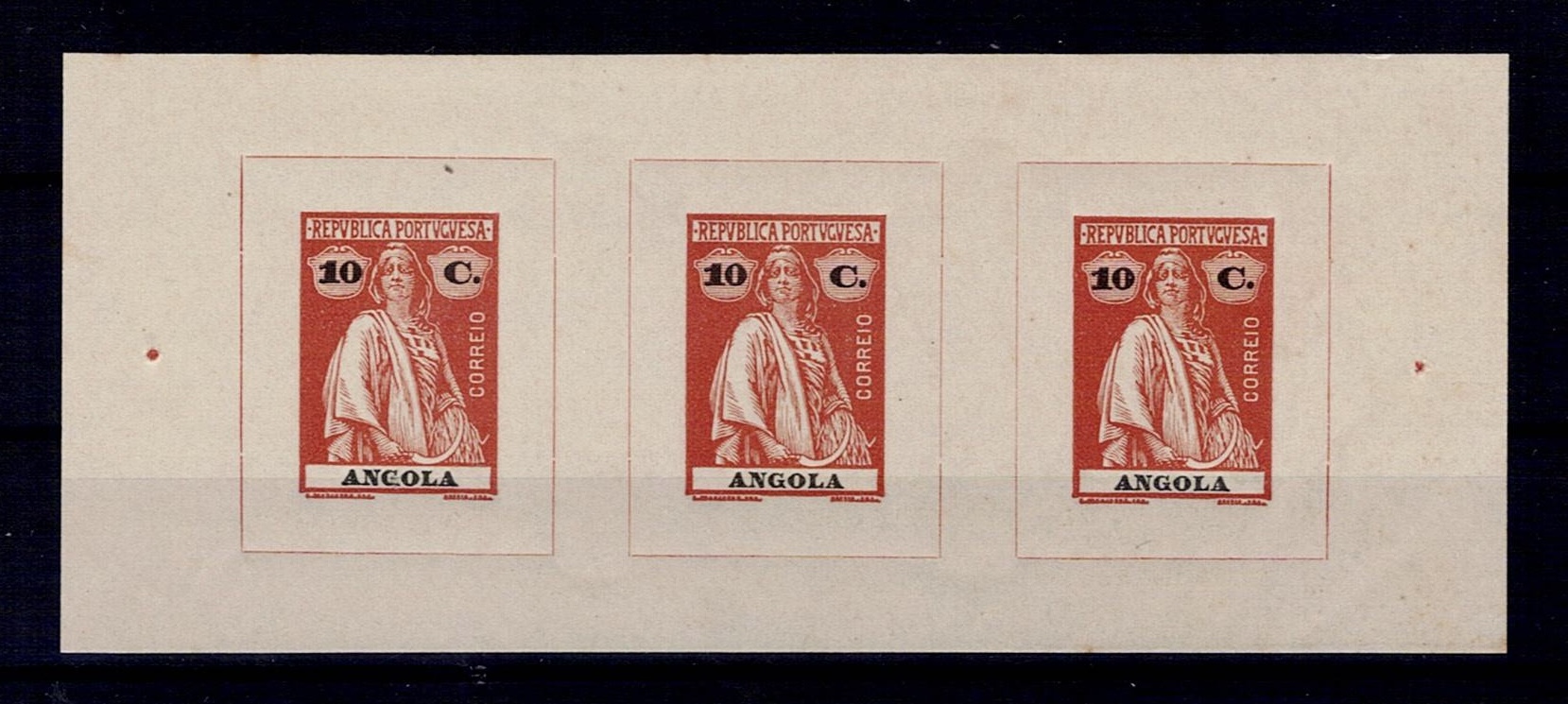 1358 imageAngola * 1914 - Ceres. MF151, 10c. Sheet with 3 coloured proofs in orange-red (colour approved for this value) with wide margins and with a frame on each of the proofs, not toothed, on smooth, medium paper, considered to be clandestine. Copy without defects or repairs, with good colour(Image 1)