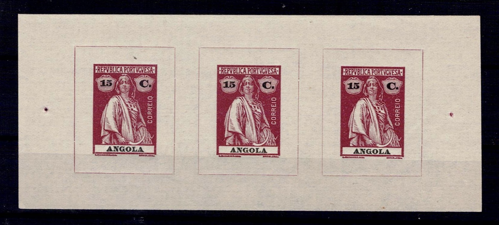 1359 imageAngola * 1914 - Ceres. MF152, 15 c. Sheet with 3 coloured proofs in lilac-red (colour approved for this value) with wide margins and with a frame on each of the proofs, not toothed, on smooth, medium paper, considered to be clandestine. Copy without defects or repairs, with good colour(Image 1)