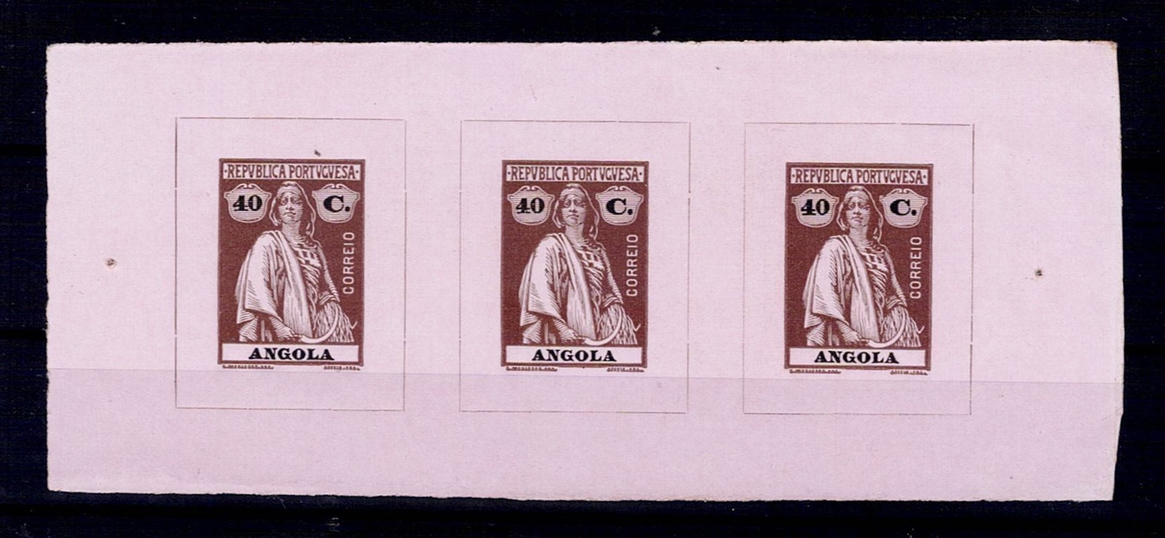 1360 imageAngola 1914 – Ceres. MF155, 40c, brown w/o pink. Strip with 3 colour proofs, squared, not dented, without gum, without defects or repairs, with good colour. Proofs considered to be clandestine.(Image 1)