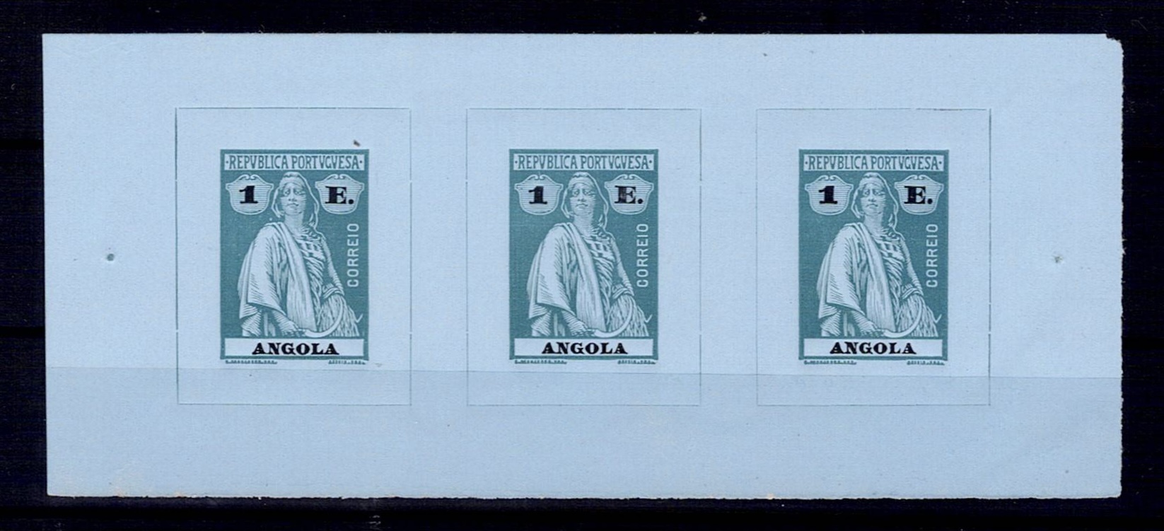 1362 imageAngola 1914 – Ceres. MF157, 1 Esc. Horizontal strip with 3 colour proofs in green on blue coloured porcelain paper, not dented, squared, without gum, without defects or repairs, with good colour, considered to be clandestine.(Image 1)