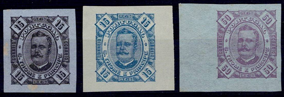 1363 imageSão Tomé and Príncipe 1893-95 D. Carlos Diogo Neto proofs. 3 unperforated color proofs of stamp Mf#33, 15 reis in black on blue paper, blue and violet on green paper, all not approved for the rate. Black proof with defects.(Image 1)