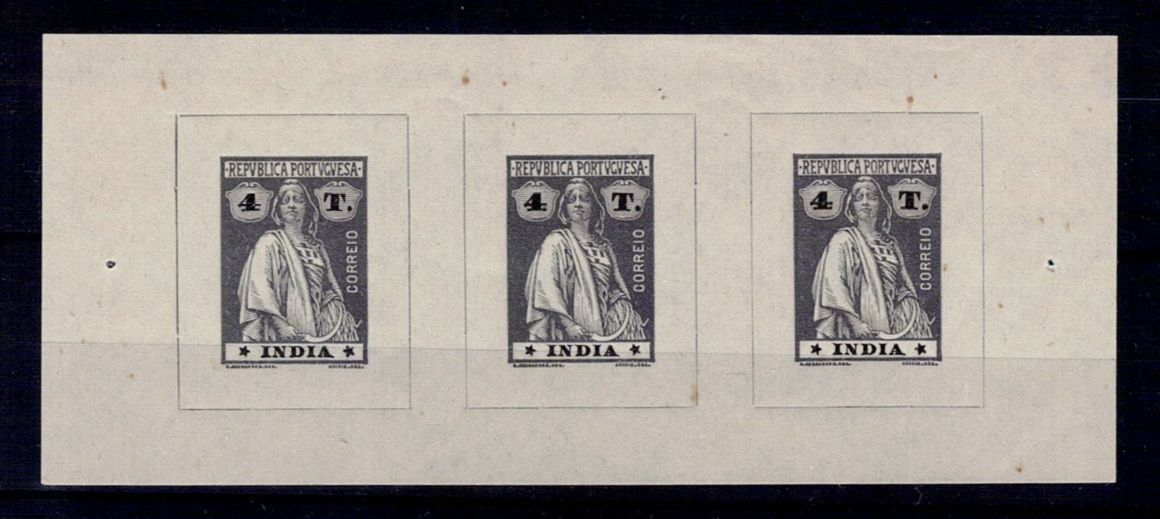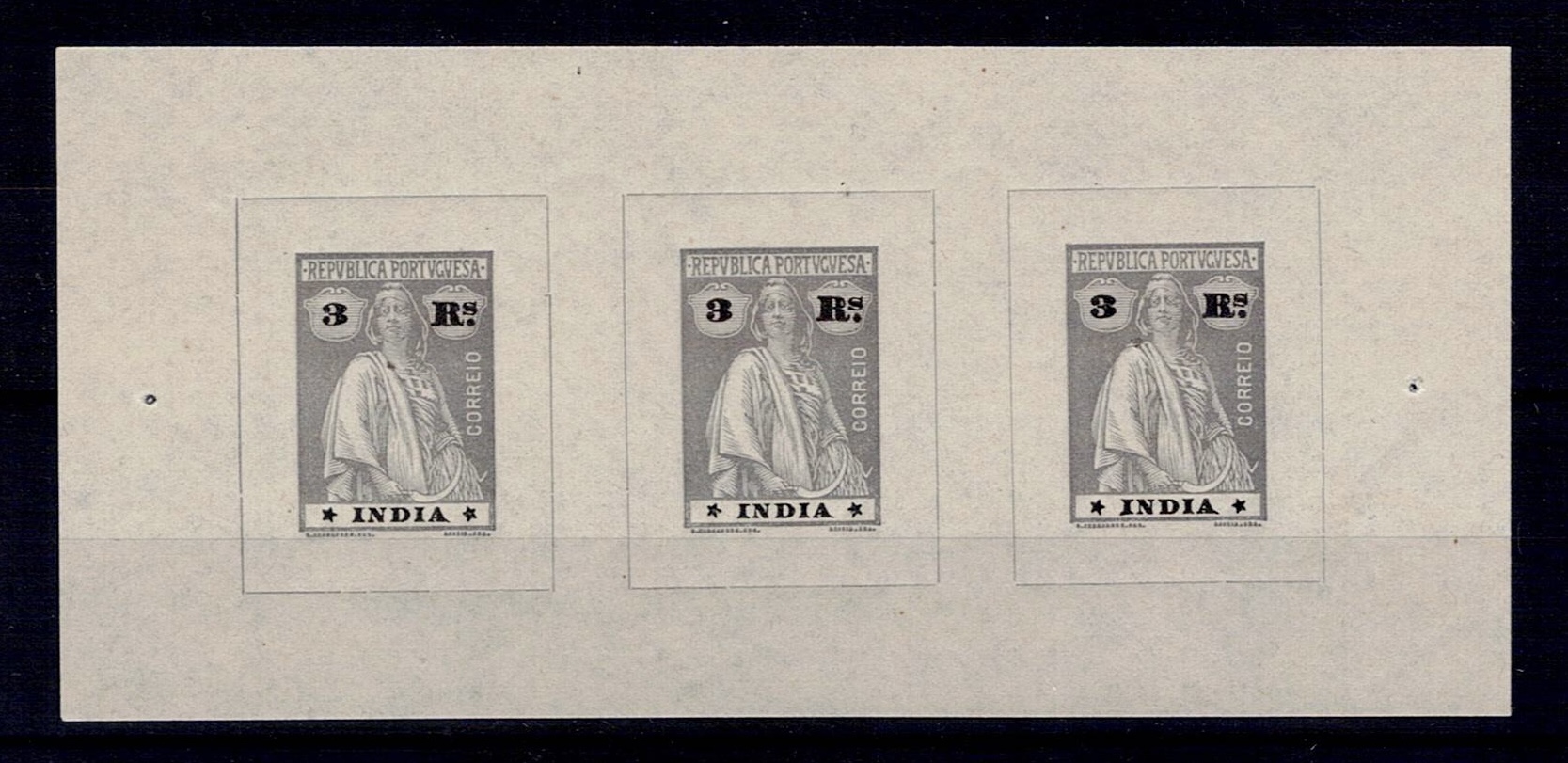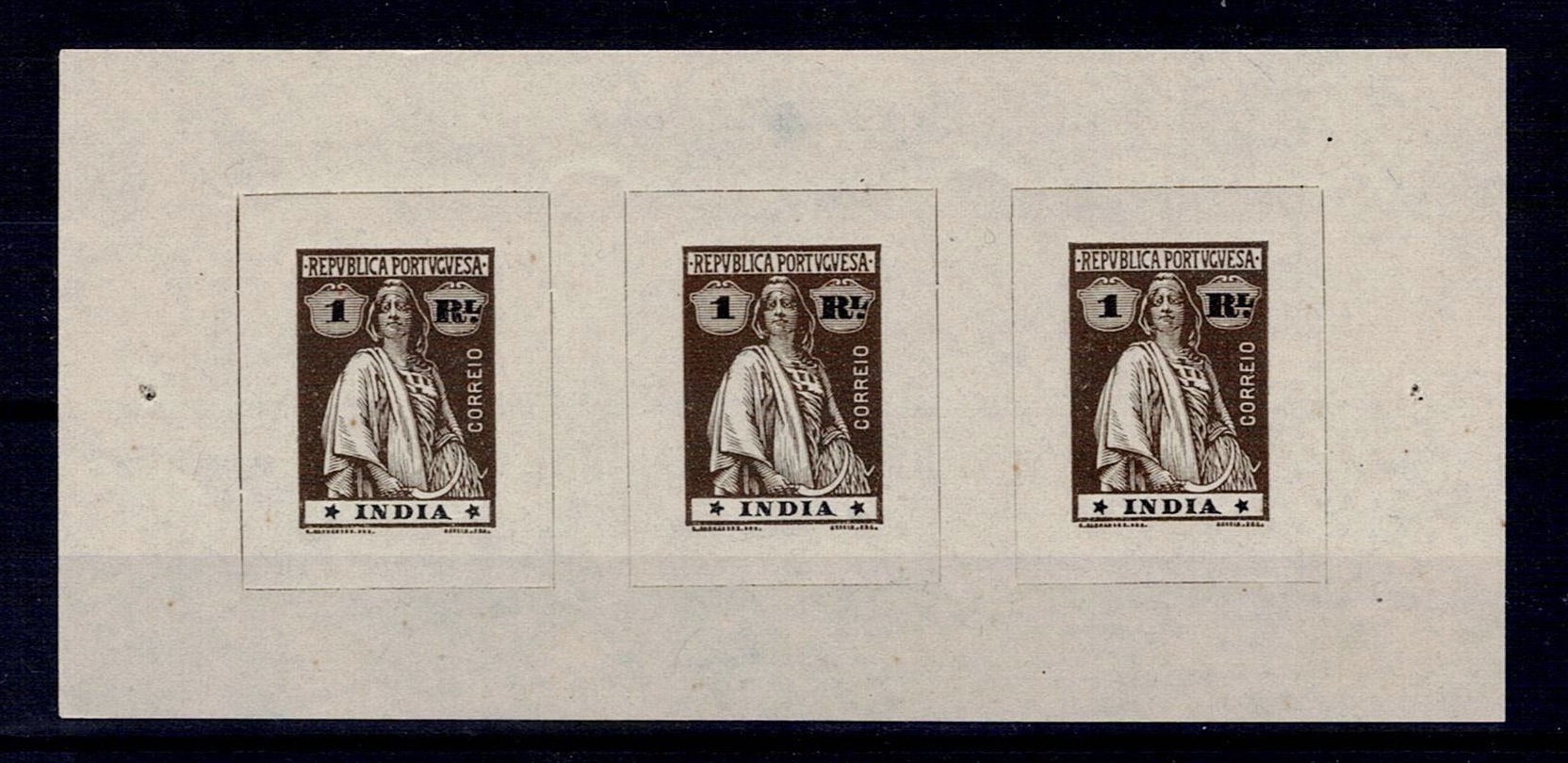 1367 imageIndia 1914 – Ceres. Mf#254, 1 reis. Strip with 3 sepia colour proofs, not dented, with stars III-IV, printed with wide margins, framed, considered to be clandestine. Copy without defects or repairs. MB and MR.(Image 1)