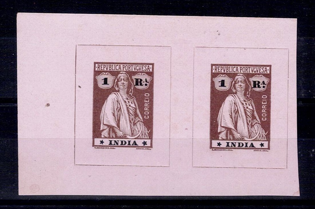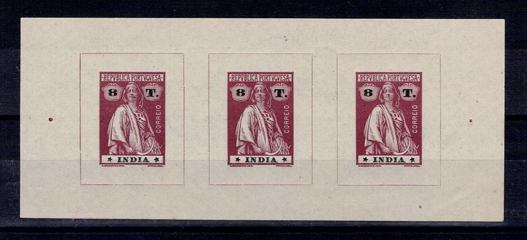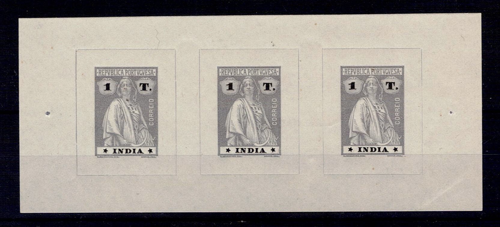 1367 imageIndia 1914 – Ceres. Mf#254, 1 reis. Strip with 3 sepia colour proofs, not dented, with stars III-IV, printed with wide margins, framed, considered to be clandestine. Copy without defects or repairs. MB and MR.(Image 1)