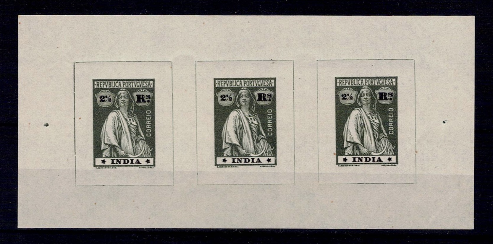 1368 imageIndia 1914 – Ceres. Mf#257, 2.5 reis. Strip with 3 colour proofs in olive green, not dented, with stars III-IV, printed with wide margins, framed, considered to be clandestine. Copy without defects or repairs. MB and MR.(Image 1)