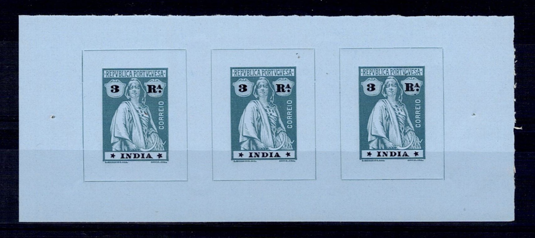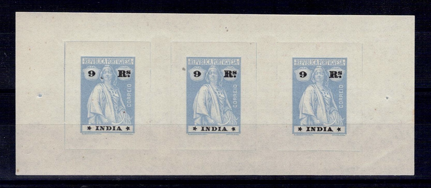 1370 imageIndia 1914 – Ceres. Mf#262, 9 reis. Strip with 3 colour proofs in ultramarine blue, not dented, with stars III-IV, printed with wide margins, framed, considered to be clandestine. Copy without defects or repairs. MB and MR.(Image 1)