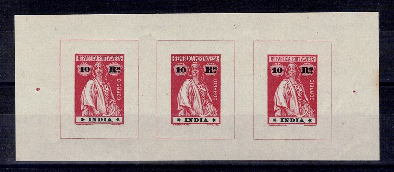 1371 imageIndia 1914 – Ceres. Mf#263, 10 reis. Strip with 3 coloured proofs in carmine, not dented, with stars III-IV, printed with wide margins, framed, considered to be clandestine. Copy without defects or repairs. MB and MR.(Image 1)