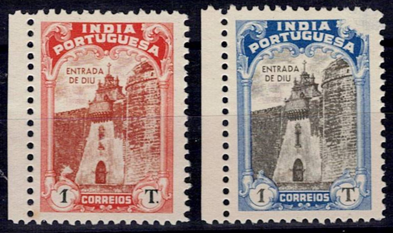1377 imageIndia Proofs. Set of two color proofs, perforated, for unissued India stamps: Diu Entry 1 tanga in blue and dark green + orange and light brown, both leaf edges, ungummed. Proofs with irregular perforation, good color, with the blue damaged in the upper right corner.(Image 1)