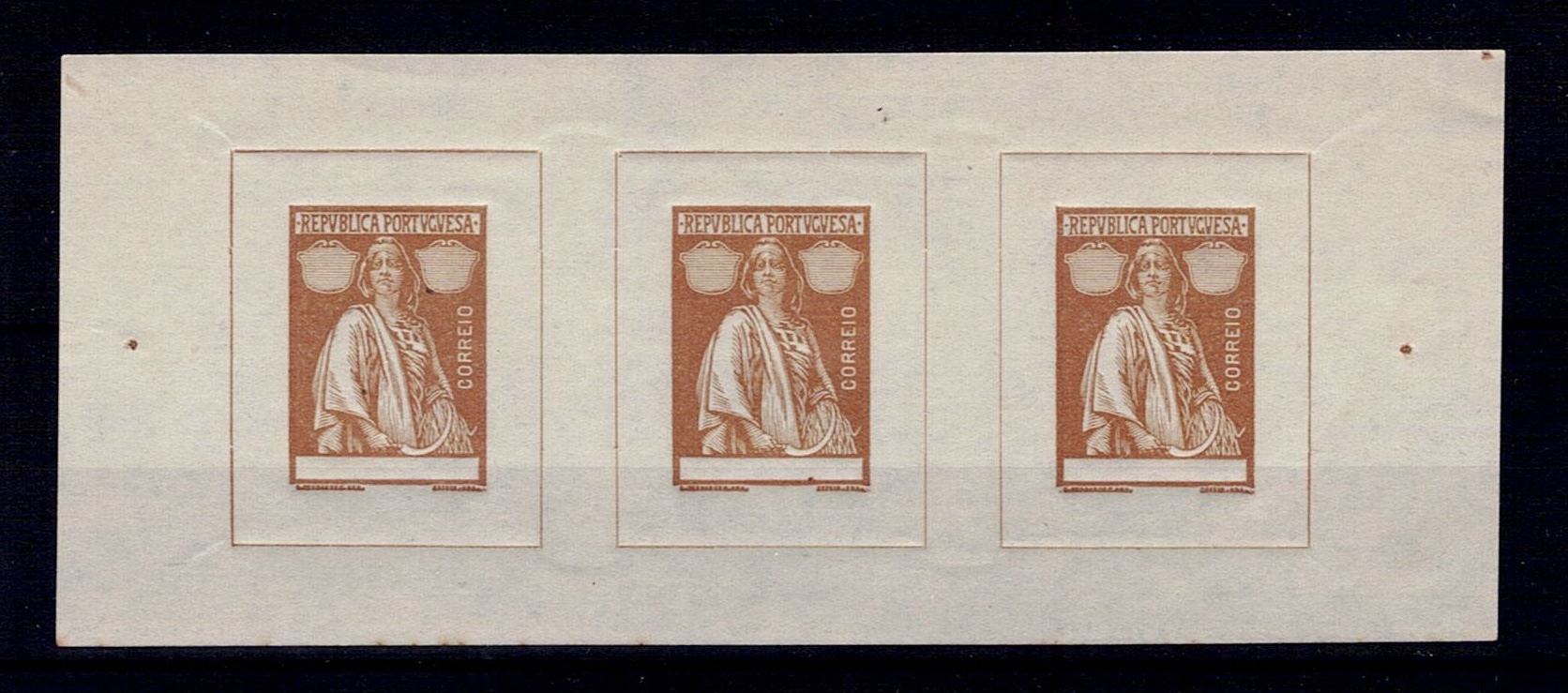 1379 imageMacau 1914 – Ceres. Strip with 3 colour proofs in bistre (colour approved for the 12-avos stamp), on fine smooth paper (not approved for this issue), not perforated, printed with wide margins, framed, without printing of the value or caption, considered to be clandestine. Copy without defects or repairs. MB and MR.(Image 1)