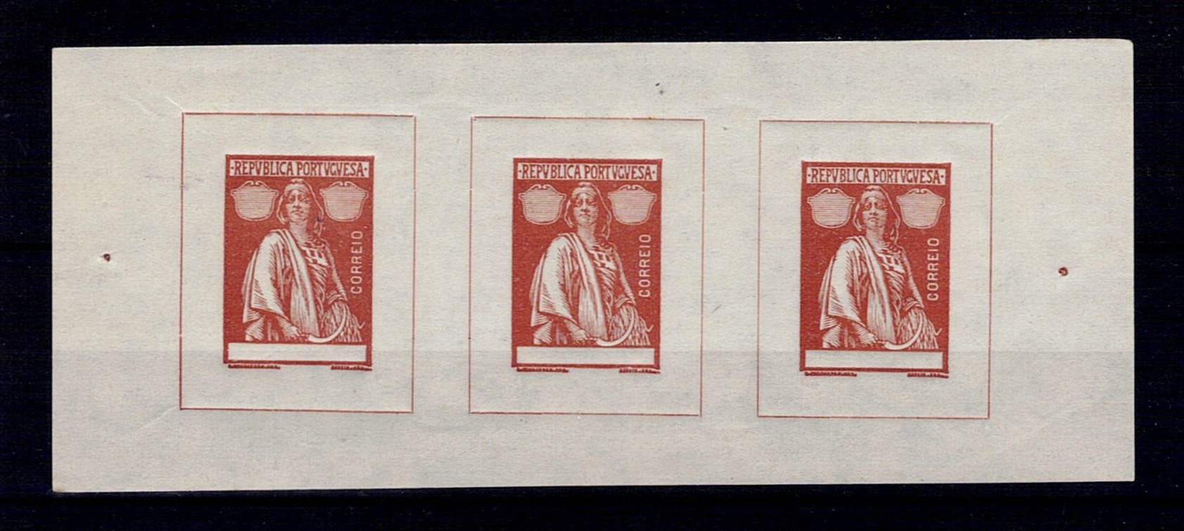 1380 imageMacau 1914 – Ceres. Strip with 3 coloured proofs in brick (colour approved for the 20-avos stamp), on fine plain paper (not approved for this issue), not perforated, printed with wide margins, framed, without printing of the value or caption, considered to be clandestine. Copy without defects or repairs. MB and MR.(Image 1)