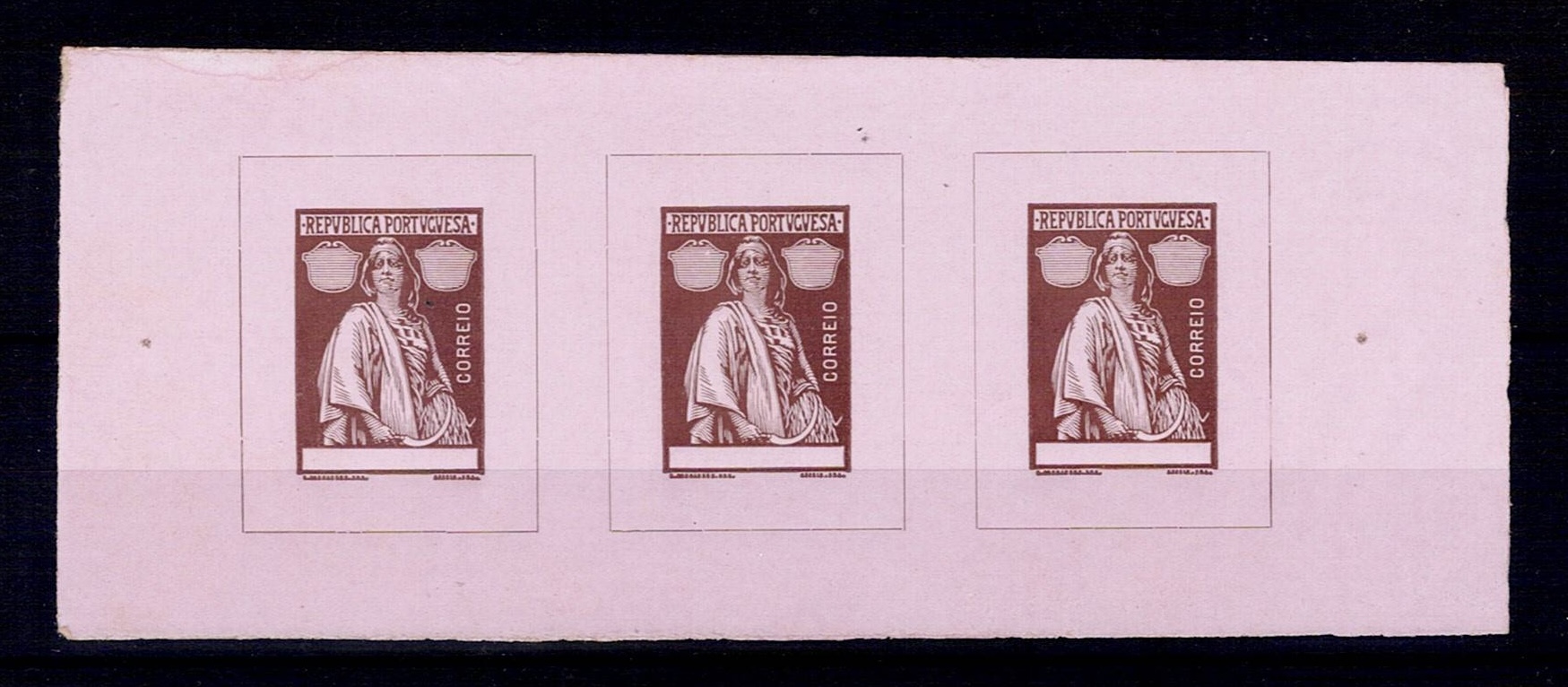 1381 imageMacau 1914 – Ceres. Strip with 3 coloured proofs in brown, on pink coloured porcelain paper (colour and paper approved for the value of 76ths), not perforated, printed with wide margins, framed, without printing of the value or caption, considered to be clandestine. Copy without defects or repairs. MB and MR.(Image 1)