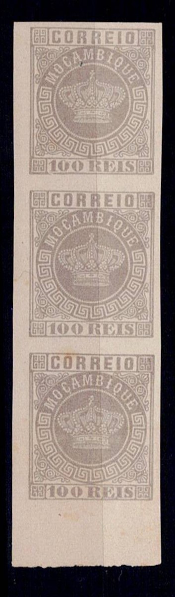 1382 imageMozambique 1876 Crown Proofs. Strip of 3 color proofs of Mf#7, 100 reis lilac mauve, unperforated. Good(Image 1)