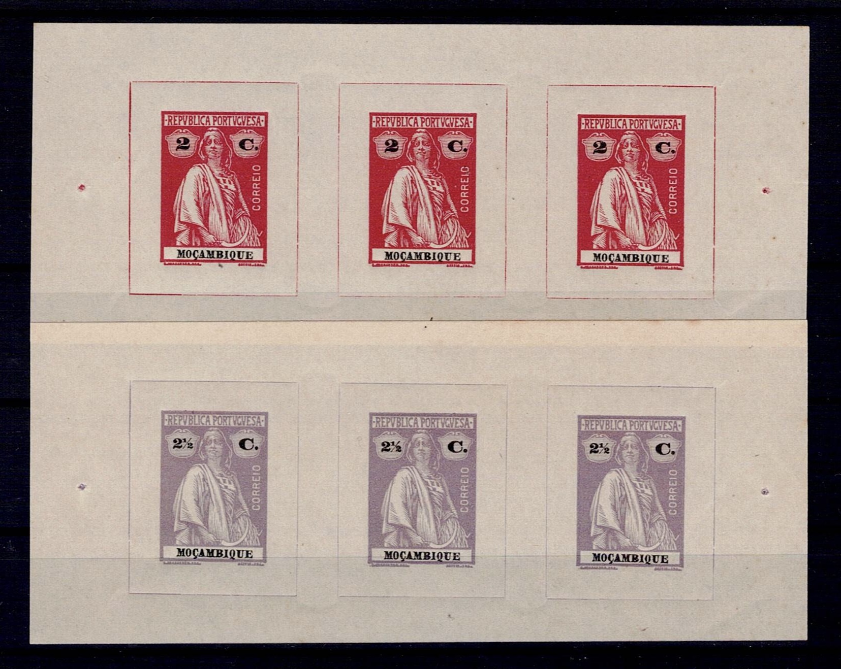 1383 imageMozambique 1914 – Ceres. MF157, 2 c, carmine and MF158, 2.5 c, light violet. 2 strips with 3 colour proofs each, squared, not jagged, without gum, without defects or repairs, with good colour. Proofs considered to be clandestine.(Image 1)