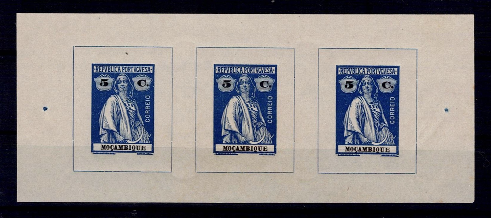 1384 imageMozambique 1914 – Ceres. MF159, 5 c, dark blue. Strip with 3 colour proofs, squared, not jagged, without gum, without defects or repairs, with good colour. Proofs considered to be clandestine.(Image 1)