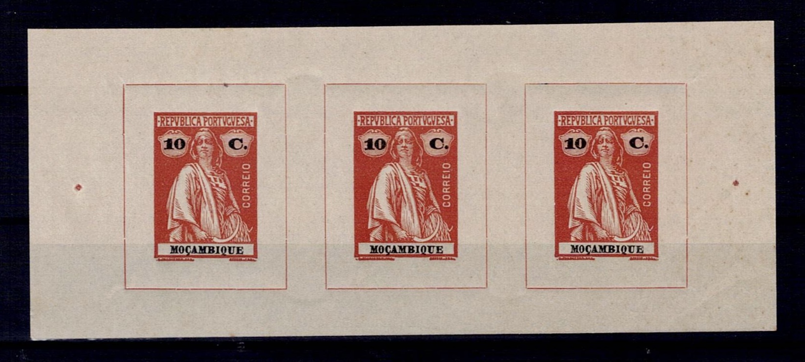 1385 imageMozambique 1914 – Ceres. MF162, 10 c. orange red. Strip with 3 colour proofs, squared, not jagged, without gum, without defects or repairs, with good colour. Proofs considered to be clandestine.(Image 1)
