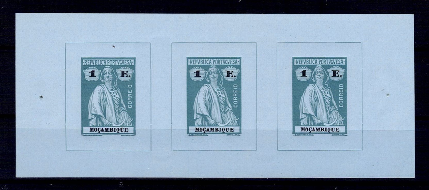 1386 imageMozambique 1914 – Ceres. Mf#168, 1 Esc. Horizontal strip with 3 color proofs in green on blue colored porcelain paper, not dented, squared, without gum, without defects or repairs, in good color, considered clandestine.(Image 1)