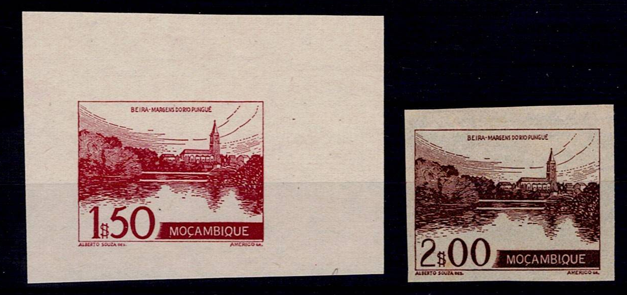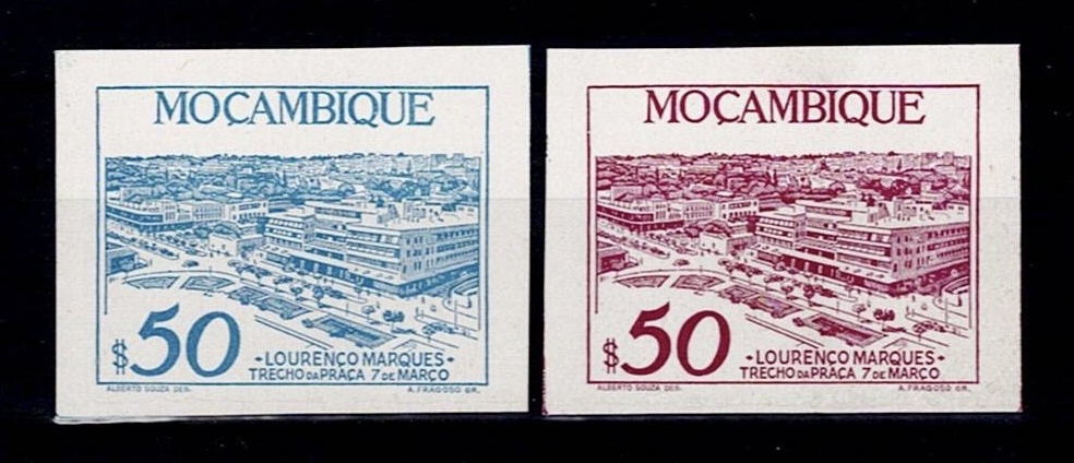 1388 imageMozambique Proofs 1948-49 Views. Pair of proofs of Mf#329, 50 c. in lilac and light blue, both not approved for issue. New proofs, unperforated, ungummed.(Image 1)