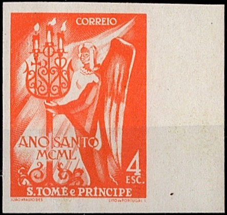 1390 imageSão Tomé and Príncipe * 1950 – Holy Year. Drawing by João Araújo. MF350, 4E. Color proof, right margin of sheet, in orange on enamel paper, not approved for issue, not perforated, with original hingeless gum. Copy without defects or repairs and good color.(Image 1)
