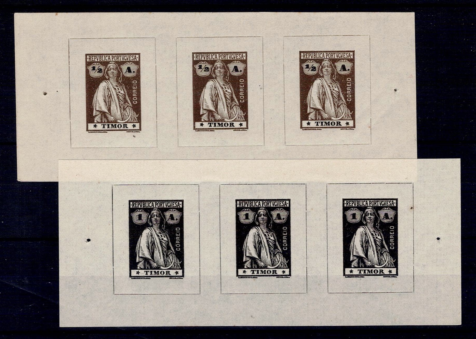 1391 imageTimor 1914 – Ceres. Mf#162, 1/2 avo and Mf#163, 1 avo. 2 strips with 3 colour proofs in sepia and black, not indented, with stars III-IV x2 and I-IV, printed with wide margins, framed, considered to be clandestine. Copy without defects or repairs. MB and MR.(Image 1)