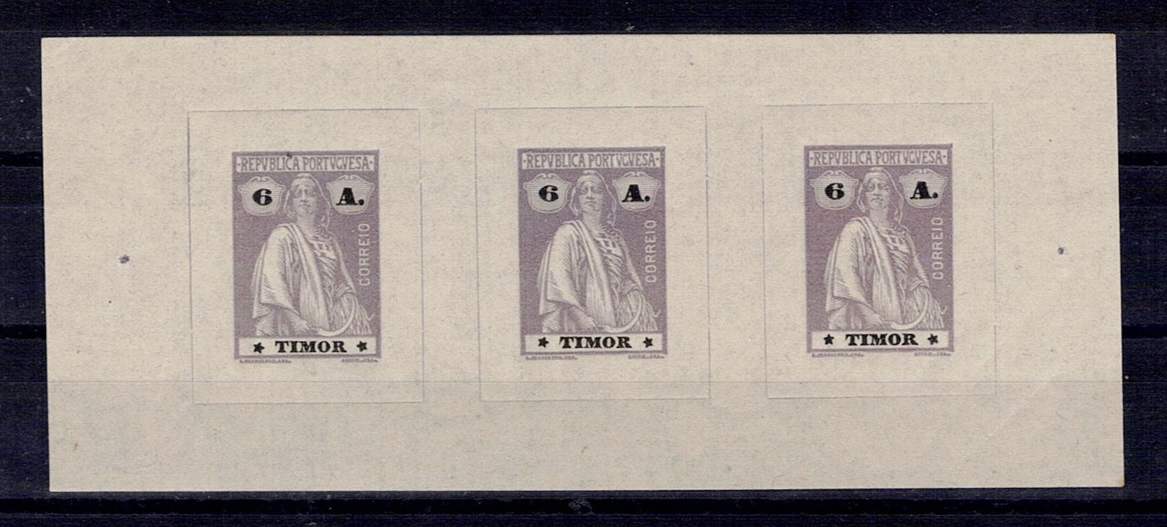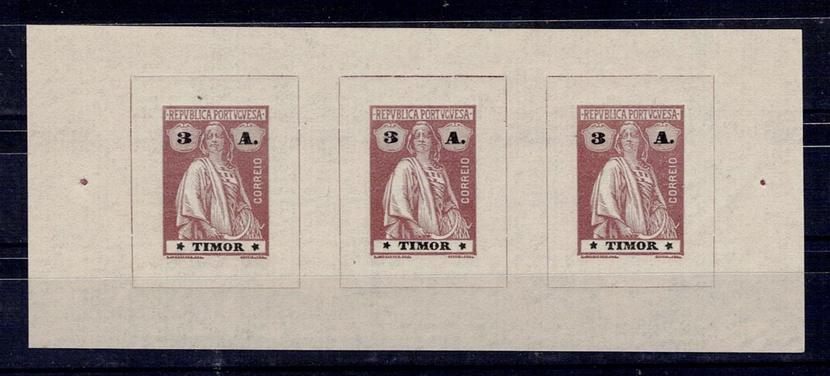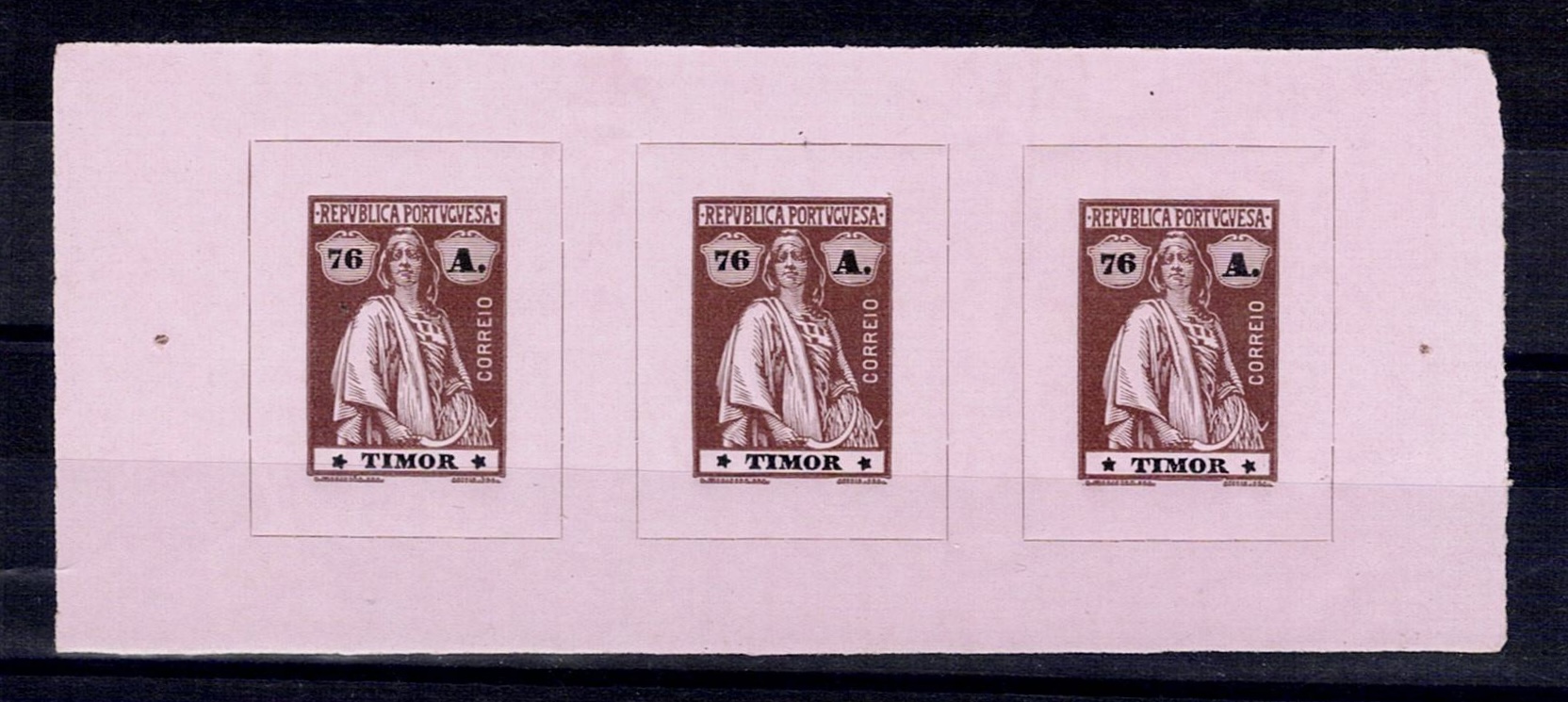 1392 imageTimor 1914 – Ceres. Mf#165, 3 avos. Strip with 3 colour proofs in light brown, not indented, with stars III-IV x2 and I-IV, printed with wide margins, framed, considered to be clandestine. Copy without defects or repairs. MB and MR.(Image 1)