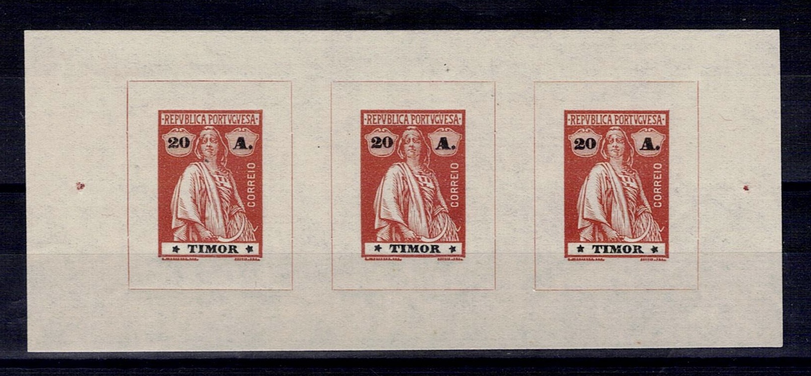 1394 imageTimor 1914 – Ceres. Mf#171, 20 avos. Strip with 3 coloured proofs in brick, not indented, with stars III-IV x2 and I-IV, printed with wide margins, framed, considered to be clandestine. Copy without defects or repairs. MB and MR.(Image 1)