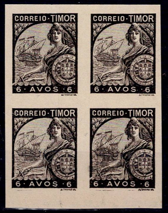 1396 imageTimor 1935 Standards Proofs. Drawing and engraving by Arnaldo Fragoso. QUADRA of Mf#212, 6 avos. Color proof in black, color not approved for the rate, lower edge of the sheet, not indented, without gum.(Image 1)