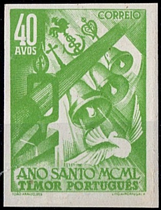 1397 imageTimor * 1950 – Holy Year. Drawing by João Araújo. MF273, 40 avos. Color proof in green on enamel paper, not approved for issue, not perforated, with original hingeless gum. Copy without defects or repairs and good color.(Image 1)
