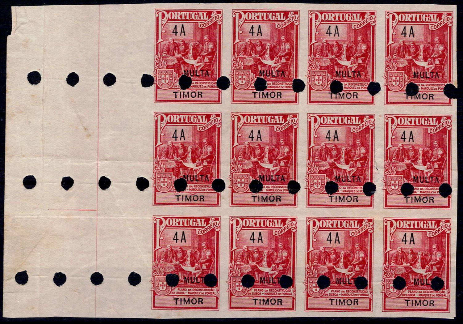 1399 imageTimor 1925 Proofs Postage Stamped. Block of 12 unperforated edge proofs, Mf#IPP2, 4ths with MULTA overprint, carmine, from Waterlow & Sons, with security holes. Proof without gum, with hinge marks, and with some defects.(Image 1)