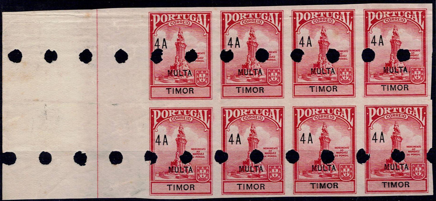 1400 imageTimor 1925 Proofs Postage Stamped. Block of 8 unperforated edge proofs, Mf#IPP3, 4ths with MULTA overprint, carmine, from Waterlow & Sons, with security holes. Ungummed proof, with hinge mark.(Image 1)
