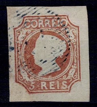 1402 imagePortugal 1853 – D. Maria II. Mf#1, 5 réis, reddish brown, smooth paper, not toothed. Used copy, with 4 good to very good margins, without defects or repairs, in good colour, obliterated with an illegible numerical stamp from the 1st reform. Catalogue value €1,600.(Image 1)