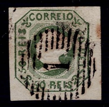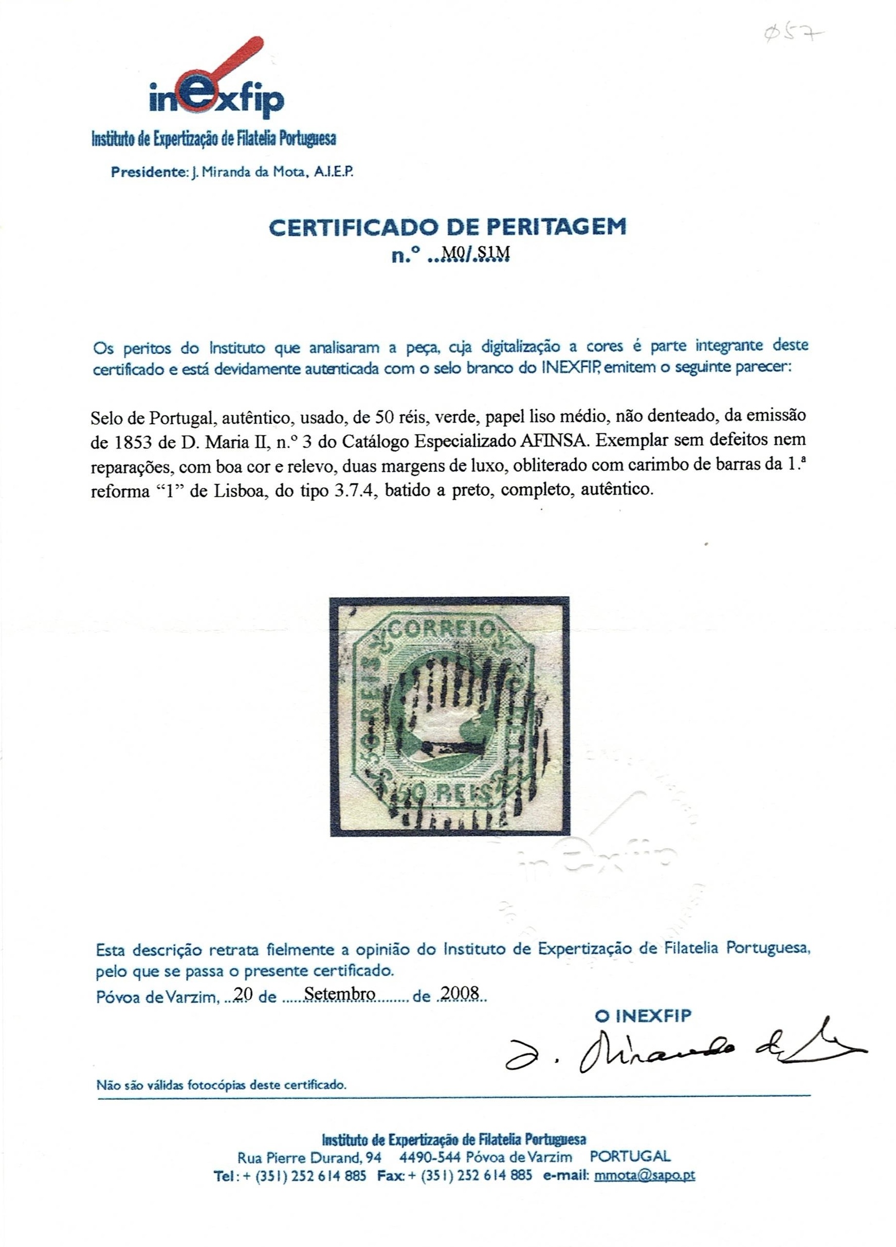 1403 imagePortugal 1853 D. Maria II. Stamp Mf#3, 50 reis green, not perforated, smooth paper. Copy with 2 luxury margins, without defects or repairs, with good colour and relief, obliterated with a 20-bar stamp from the 1st reform "1 - LISBOA" well beaten. Catalogue value €1,800.(Image 1) (Image 2)