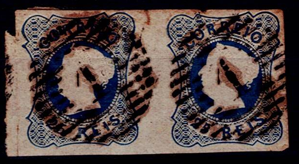 1405 imagePortugal 1853 D. Maria. Horizontal pair of Mf#2 of 25 reis blue, smooth paper without notches. Used copies with 20-bar stamps, well-beaten in black "1 - LISBOA", with short to good margins, not touching the frame, without repairs, in good color. Catalogue value €120.(Image 1)
