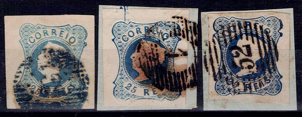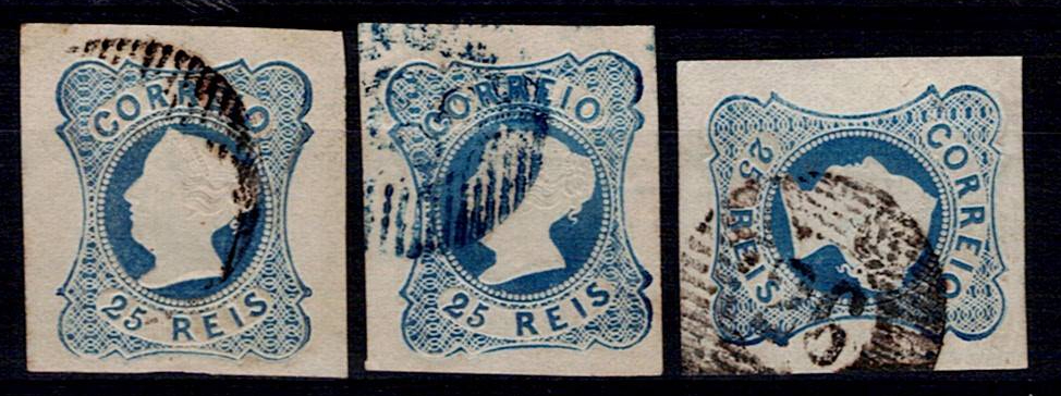 1407 imagePortugal 1853 D. Maria. 3 stamps Mf#2 25 reis with 3 different shades of blue: light blue, blue and dark blue. Used stamps, 2 on fragment, with normal to very good margins. Catalog value €120.(Image 1)