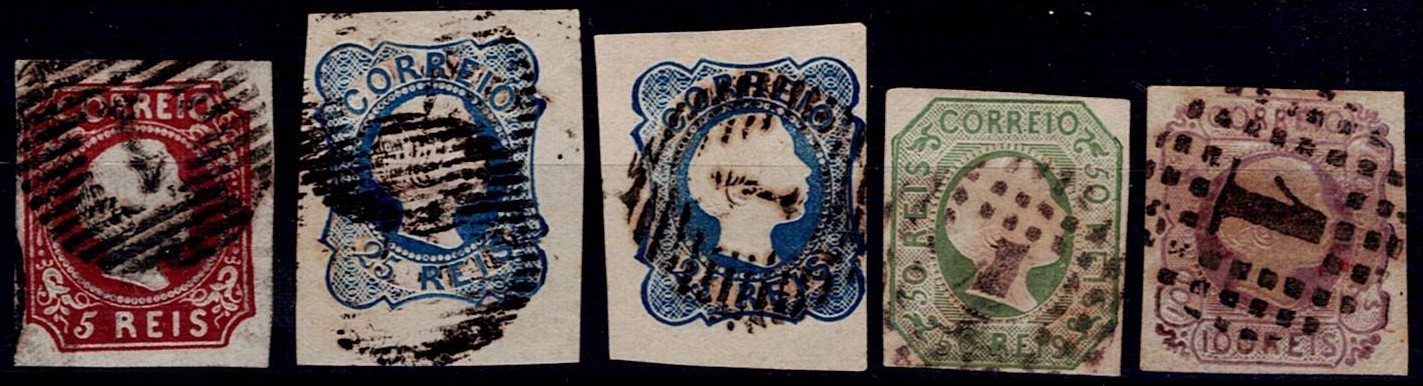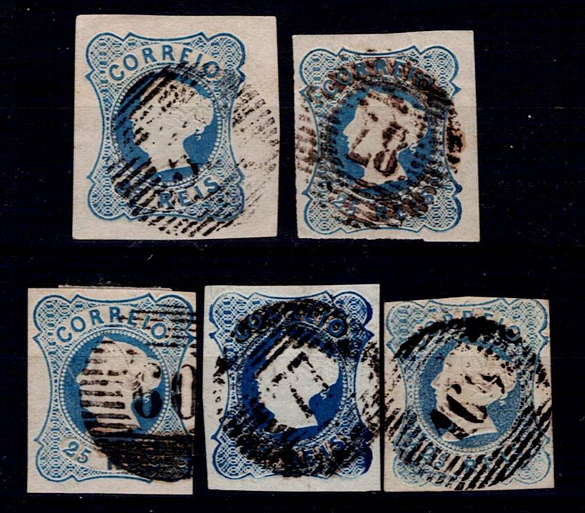 1408 imageMarcofilia Portugal 1st reform on D. Maria II stamps. Set of 5 stamps Mf#2, 25 reis blue, canceled by bar numeric stamps from the 1st reform 5?, 60, 77, 87, 16? of the 20-bar type.(Image 1)