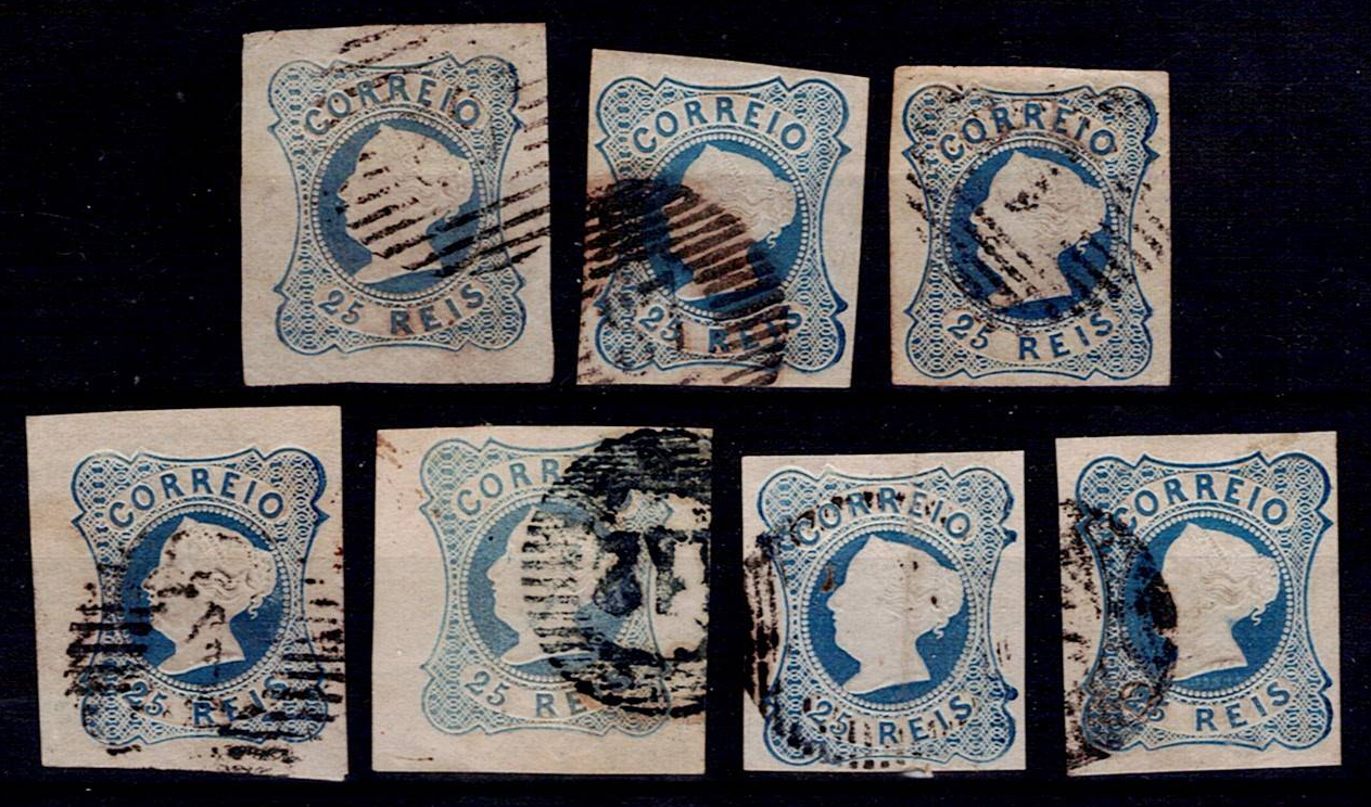 1409 imagePortugal 1853 D. Maria. 7 used stamps D. Maria 25 reis blue Mf#2 with 20-bar postmarks from the 1st reform, not legible.(Image 1)