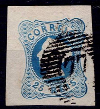1410 imageMarcofilia Portugal, numeric stamps from the 1st reform. D. Maria Mf#2 stamp, 25 réis blue, obliterated with a 2-bar 1st reform stamp, type 5-10-5, struck in black "77 - COIMBRA". Stamp with luxury margins, without defects or repairs, with good color and relief.(Image 1)