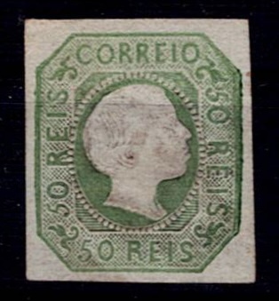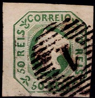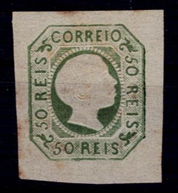 1418 imagePortugal 1855-56 D. Pedro, STRAIGHT hair. Stamp Mf#8, 50 réis, green, smooth paper. New copy, ungummed, slightly soiled, with normal to short margins, with good colour and relief. Catalogue value €450.(Image 1)