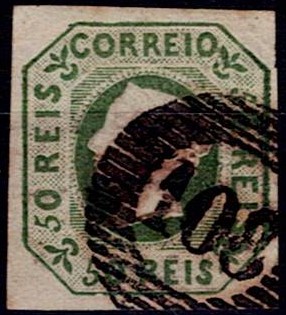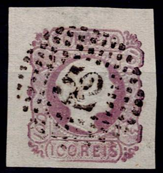 1425 imagePortugal * Numerical stamps from the 1st postal reform * 1856/58 – D. Pedro V, ringleted hair. Leaf edge stamp Mf#13, 25 réis, carmine, smooth paper, no notches. Used copy, luxury margins, no defects or repairs, obliterated with a 20-bar stamp struck in black "78 – AGUEDA".(Image 1)
