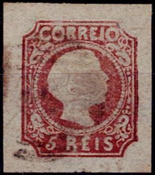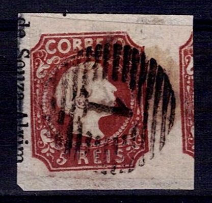 1413 imagePortugal 1855-56 D. Pedro V, straight hair. Stamp on fragment of paper Mf#5, 5 reis, reddish brown, smooth paper without notches. Used stamp, with 1 luxury margin, catching the next stamp on the right side, 1 good margin and 2 short margins touching the frame on the left side, with good colour bar stamp from the 1st reform "1 - Lisbon" struck in black. Catalogue value € 1,700.(Image 1)