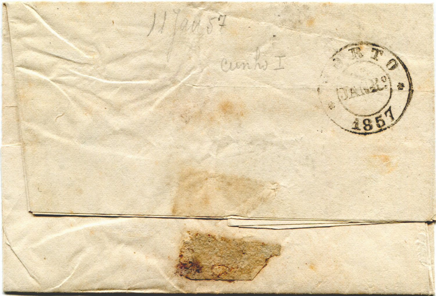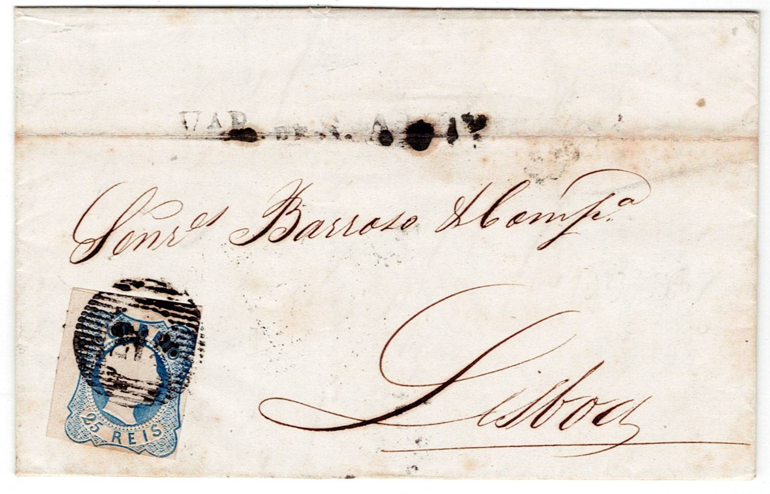 1416 imageMarcofilia. Letter sent from Vª Real de S. António on 13 July 1856, to Lisbon, postage of 25 reis D. Pedro, stamp of Barras 219, and mark VRSAntonio.(Image 1)
