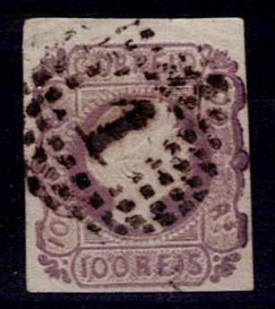 1420 imagePortugal 1855-56 D. Pedro V, straight hair. Stamp MF#9, 100 reis, lilac-mauve, with 1 good margin and 3 very short margins not touching the frame, with good colour and excess inking on the right side. Catalogue value €40.(Image 1)