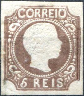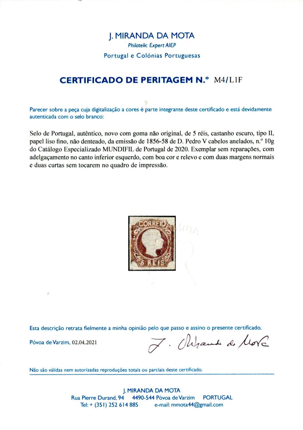1421 imagePortugal 1856/58 – D. Pedro V. Curly hair. MF#10g, 5 reis, dark brown, type II, fine smooth paper, not perforated. New copy with non-original gum, without repairs, with thinning in the lower left corner, with good color and relief, with two normal margins and two short ones. Expert certificate from J. Miranda da Mota. Catalogue value €360.(Image 1) (Image 2)