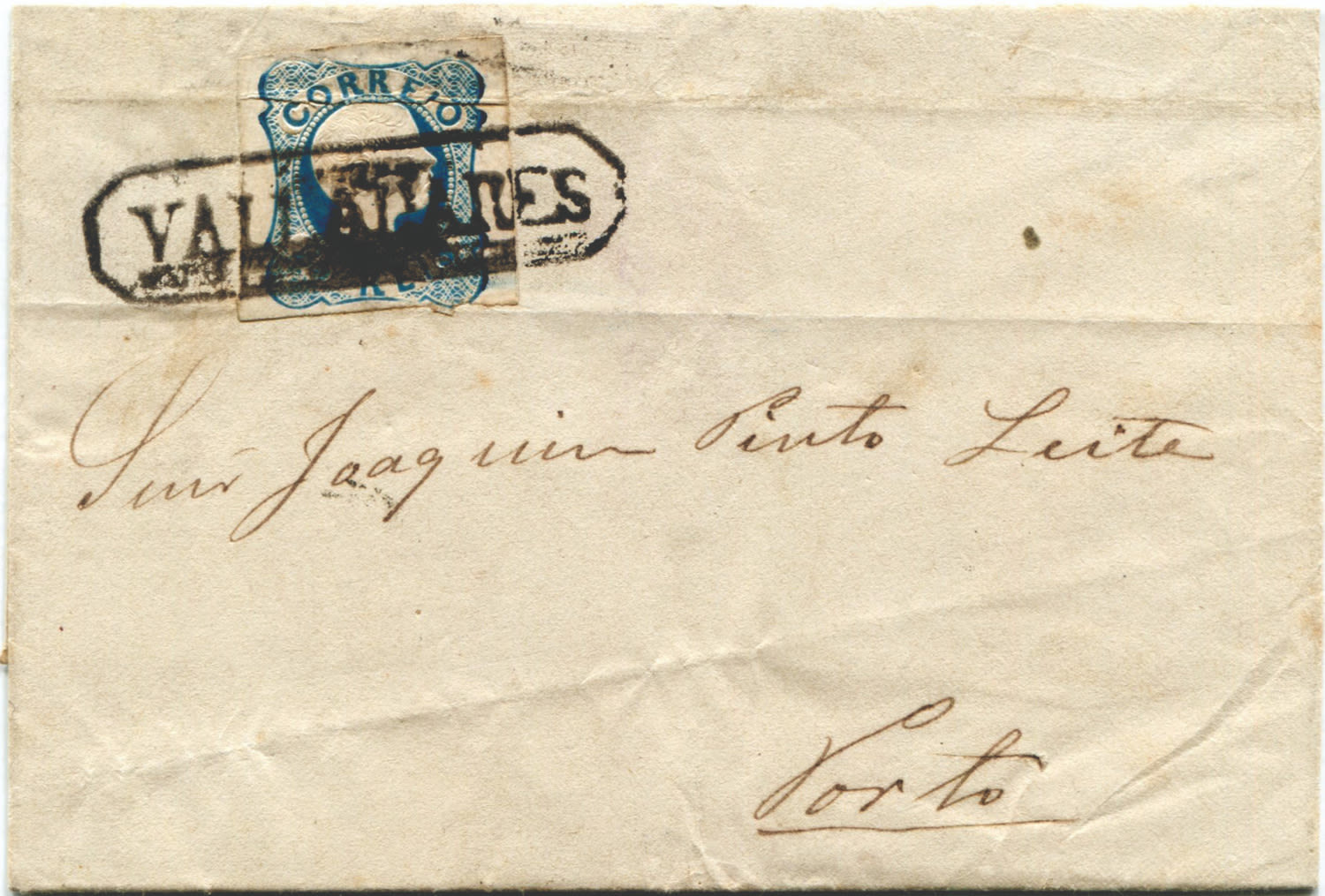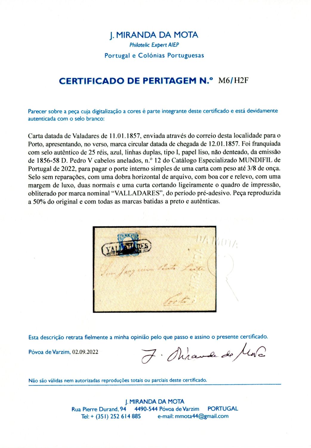 1422 imagePortugal 1856/58 – D. Pedro V. Curly hair. MF12, 25 réis, blue, double lines, smooth, unperforated paper, type I. Isolated copy in a letter dated from Valadares (11.01.57) to Porto (12.01.57) to pay the simple internal postage of a letter weighing up to 3 eighths of an ounce in accordance with the postage table in the Decree of 9.11.1852. Stamp without repairs, with a horizontal archival fold, in good colour and relief, with a luxury margin, two normal margins and one short margin, slightly cutting through the printing frame, obliterated with the nominal mark “VALLADARES” from the pre-adhesive period. Expertise certificate from J. Miranda da Mota.(Image 1) (Image 2) (Image 3)