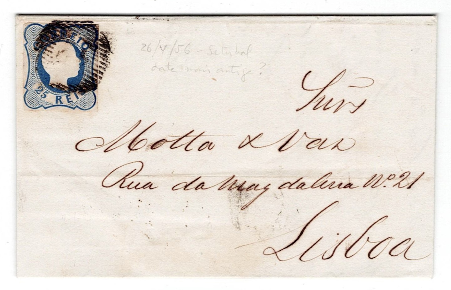 1423 imagePortugal. Issue of D. Pedro, ringleted hair, 25 reis blue stamp, in a letter from Setubal, dated 26.4.1856, (stamps issued in March 1856), to Lisbon 27.4.(Image 1) (Image 2)