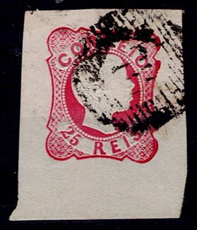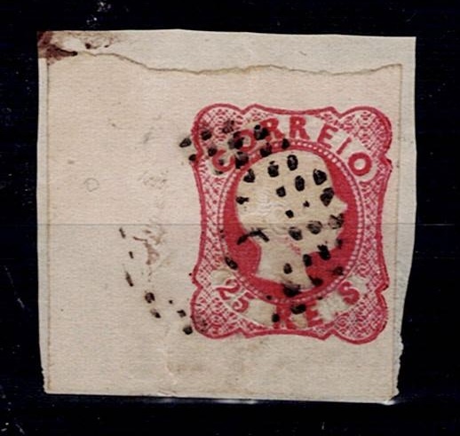 1424 imagePortugal 1856-58 D. Pedro RINGED hair. Fragment with stamp CANTO DE FOLHA of Mf#13, 25 réis, carmine, smooth paper. Used copy, with short luxury margins, obliterated with an illegible black dot stamp.(Image 1)