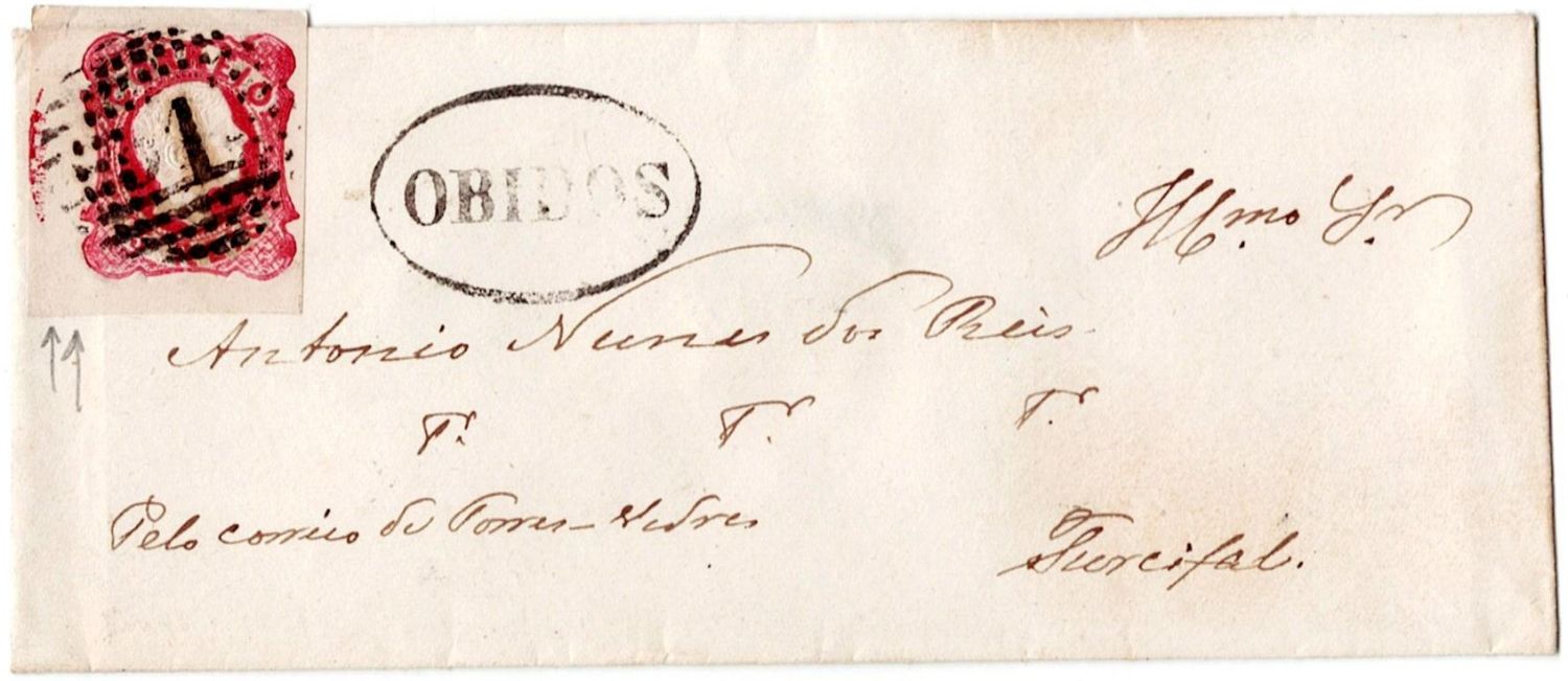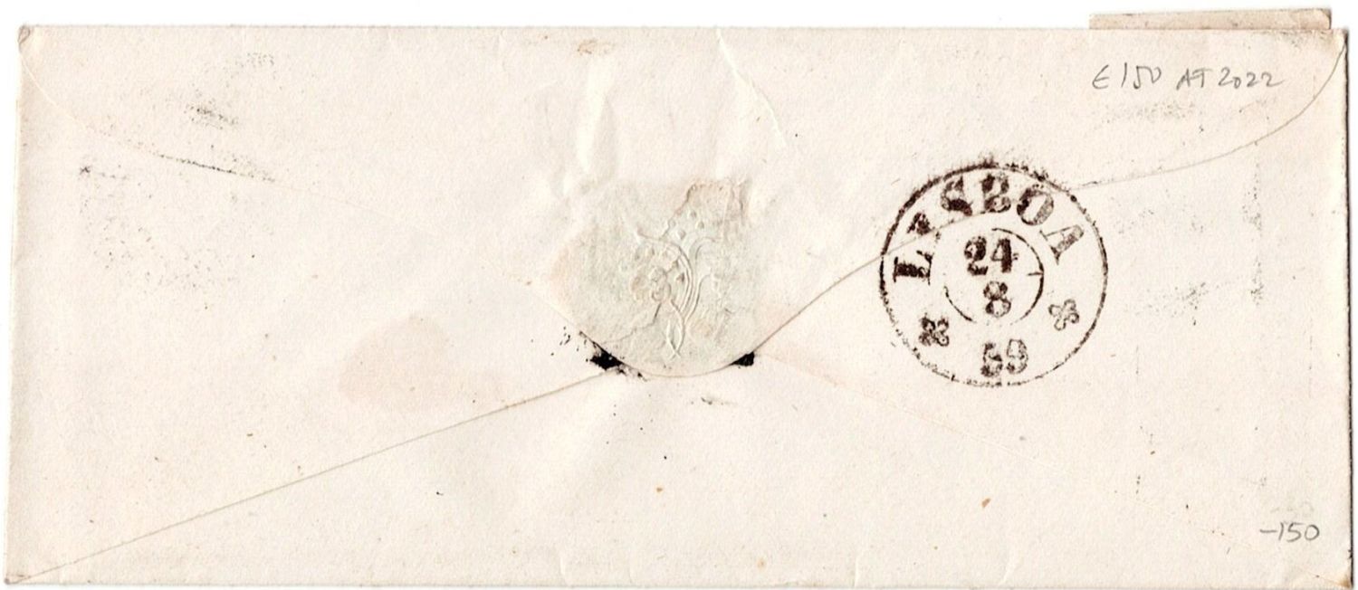 1426 imagePortugal. Letter issued from ”bidos, franked with a 25 reis pink stamp, D. Pedro, to Turcifal. It passed through Lisbon on August 24, 1859, where the stamp was annulled, and then through Torres Vedras to Turcifal. The stamp has four large margins and ink printing on the left edge of the page.(Image 1) (Image 2)