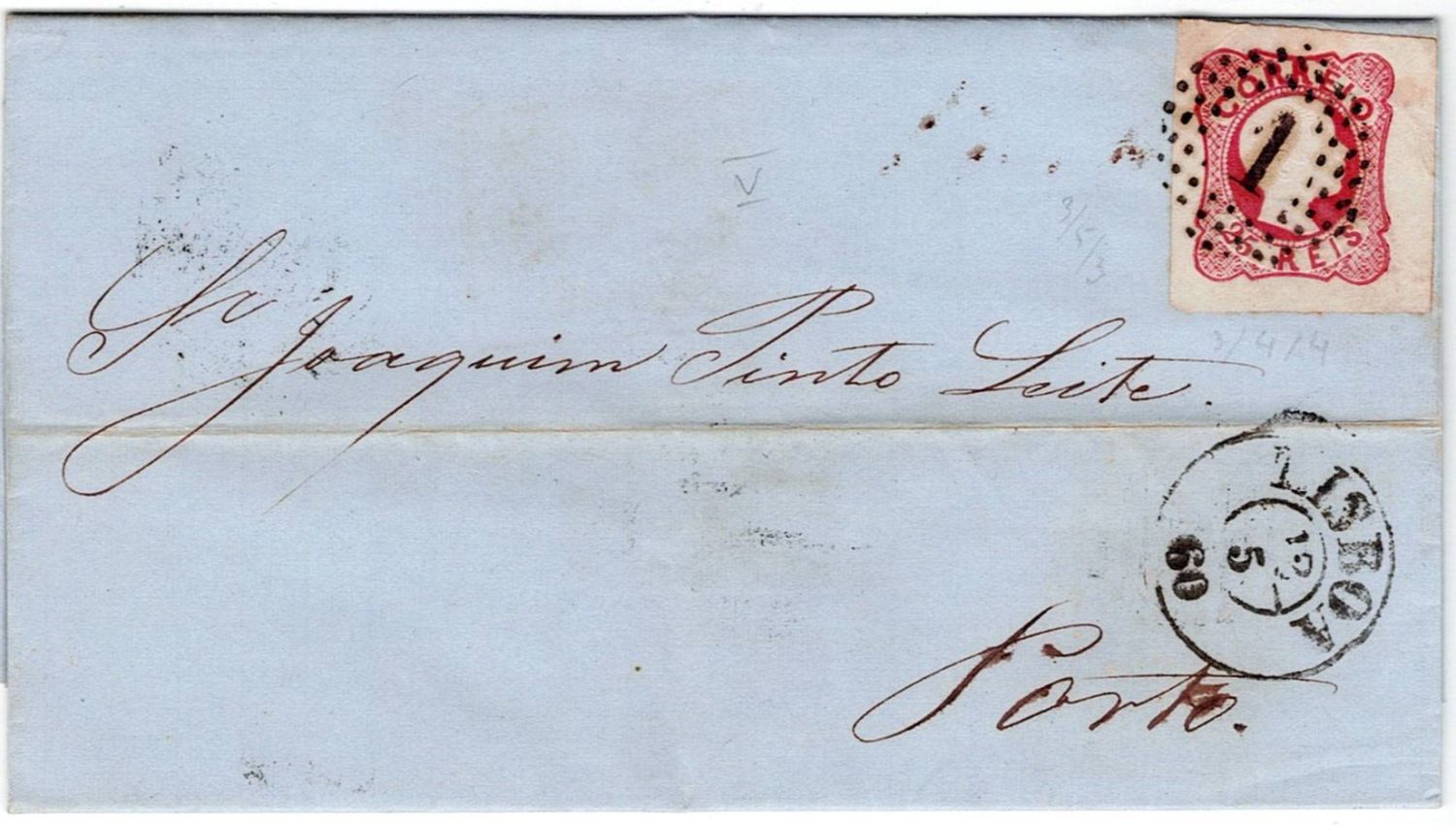 1428 imagePortugal. Letter sent from Lisbon on May 13, 1860, postage of 25 reis D. Pedro curled hair, to Porto, May 14.(Image 1)