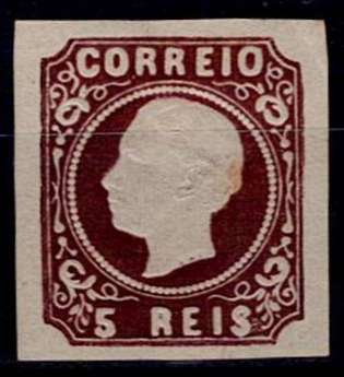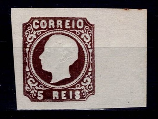 1430 imagePortugal 1862-64 – D. Luís I, Borja Freire. Stamp BORDO DE FOLHA Mf#14, 5 reis, dark brown, probable stamp III, on smooth paper. New copy, with original gum and hinge, with 2 oxide spots, with very good colour and relief, with good margins. Catalogue value € 215 .(Image 1)